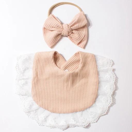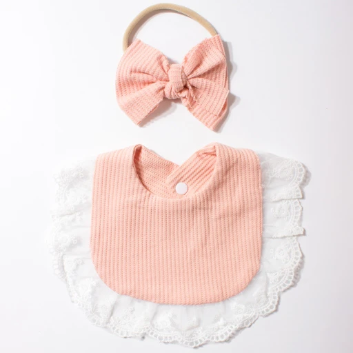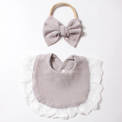Elevate your baby’s style with this elegant 2-piece baby set. Featuring a charming waffle knit bib adorned with delicate white lace ruffle trim and a matching bow headband, this set is perfect for adding a touch of sophistication to your little one’s wardrobe. Whether it’s a celebration, mealtime, or a sweet photo shoot, this set will make your baby stand out with timeless charm.