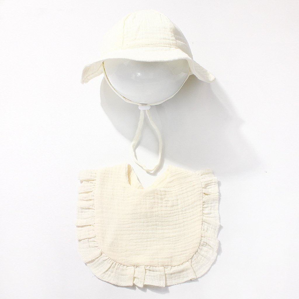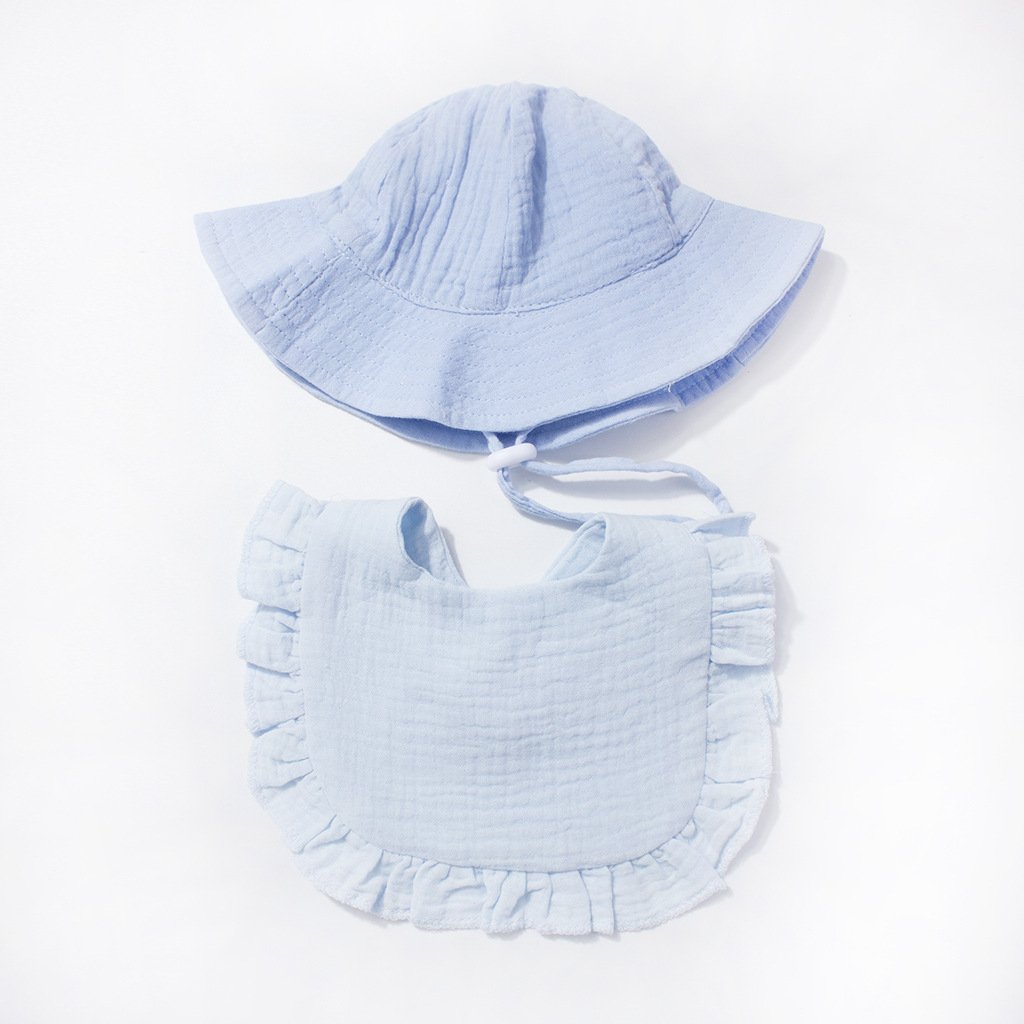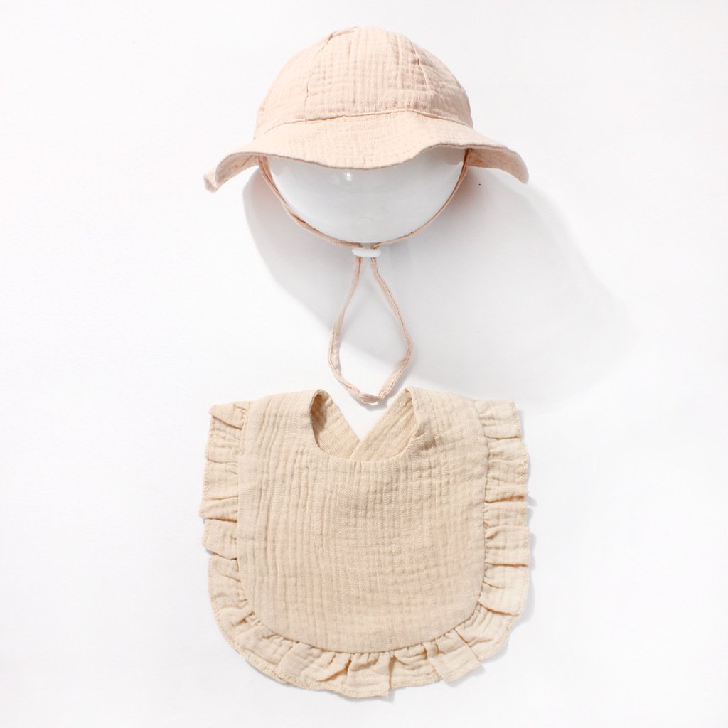 Keep your baby comfortable all day long with our carefully crafted set. The bucket hat features a wide brim to shield delicate skin from the sun, while the adjustable chin strap ensures it stays securely in place during outdoor adventures. The bib, made from soft cotton gauze, boasts delicate ruffled edges and a convenient V-neck design for easy wearing. Lightweight and naturally breathable, this set is ideal for everyday use, indoors or out.