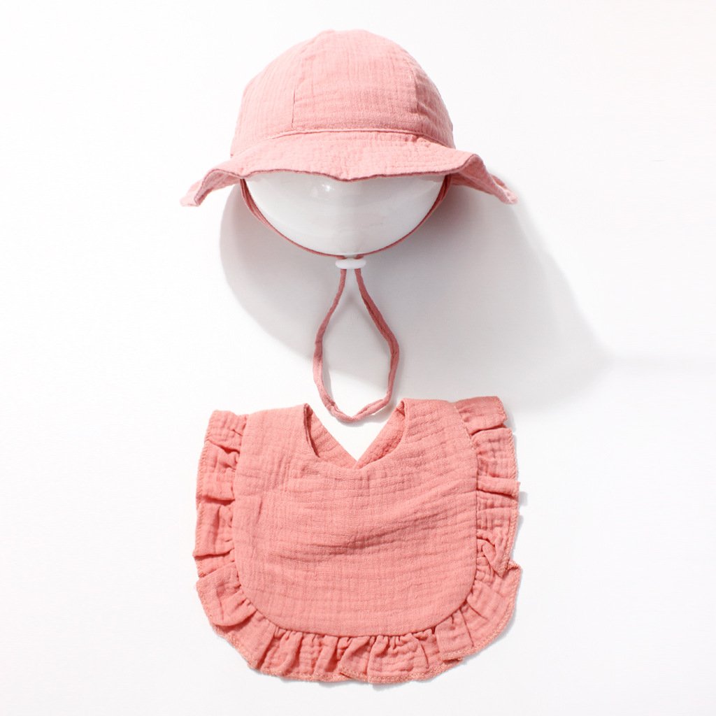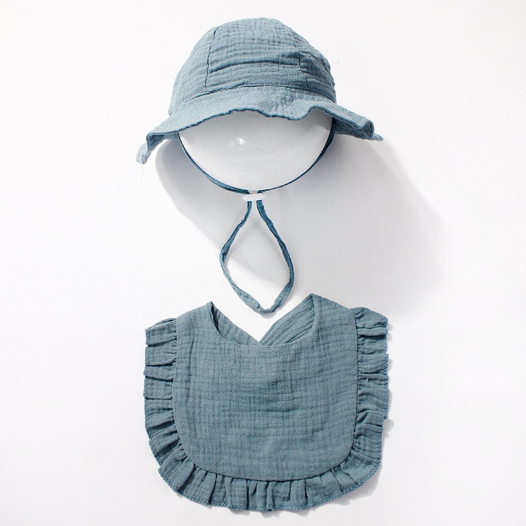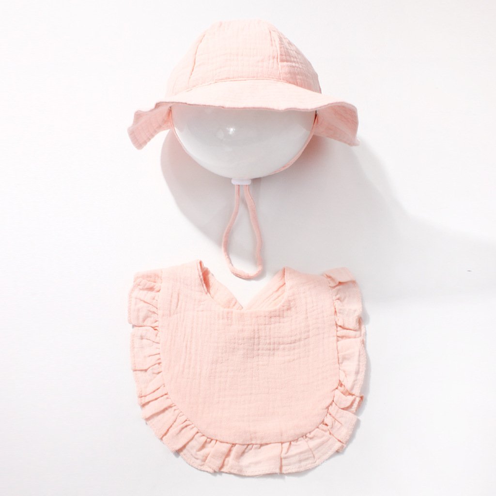 Keep your baby comfortable all day long with our carefully crafted set. The bucket hat features a wide brim to shield delicate skin from the sun, while the adjustable chin strap ensures it stays securely in place during outdoor adventures. The bib, made from soft cotton gauze, boasts delicate ruffled edges and a convenient V-neck design for easy wearing. Lightweight and naturally breathable, this set is ideal for everyday use, indoors or out.